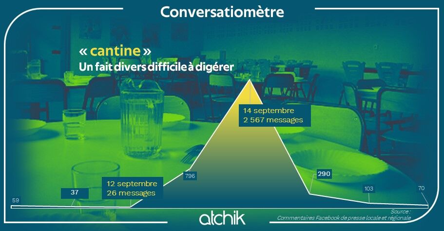 Ici, nous avons étudié les mentions du mot "cantine" quel que soit le sujet... Mais pour témoigner de la vague de réactions, nous aurions pu y ajouter tous les commentaires présents sous les posts abordant le sujet. L'émotion du moment, considérable, a réellement compté dans les conversations en ligne du moment.