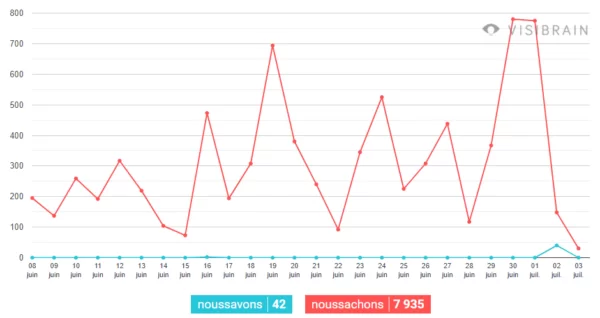 La bascule, elle, s'opère à partir du moment où #NousSavons devient plus gros que #NousSachons, dès le 4 juillet. Auparavant, le rapport de force se maintenait sans comparaison :